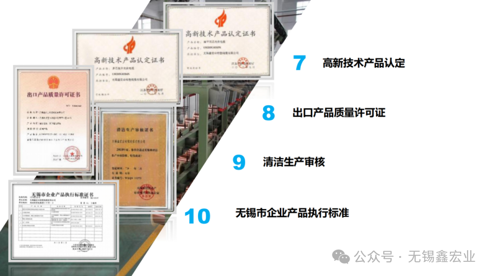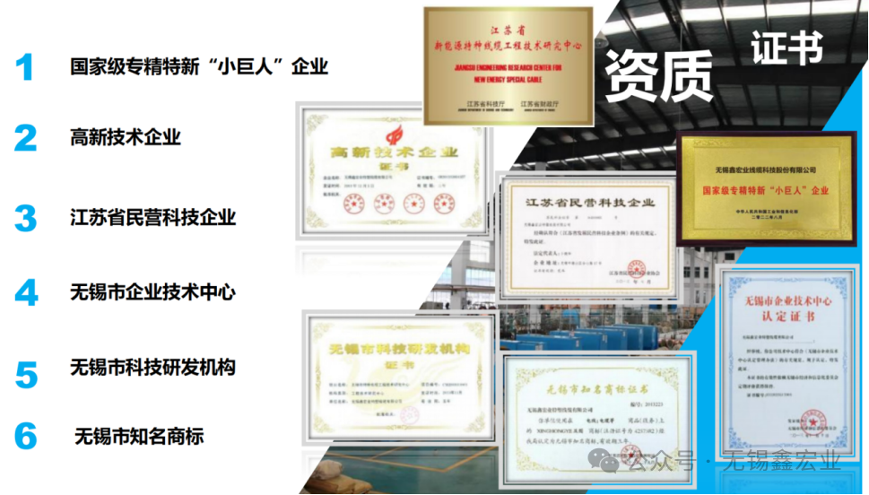 無錫鑫宏業線纜科技股份有限公司于2004年成立,高新技術企業,地處江蘇省無錫市國家級錫山經濟技術開發區, IATF16949質量體系管理企業,公司從事研發、生產和銷售新能源汽車線纜、光伏線纜、工業自動化線纜,擁有多項榮譽及資質證書。